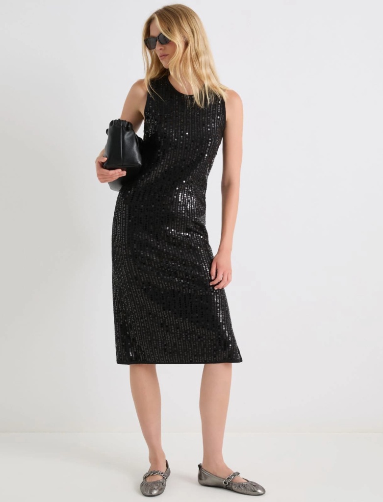 - Платье с пайетками — вечная классика для девушек. Для корпоратива предпочтительнее модели с мелкими пайетками одного спокойного оттенка. Чтобы образ не стал перегруженным, одевайте такое платье с кофтой, сумкой и обувью приглушенных тонов и лаконичными аксессуарами.