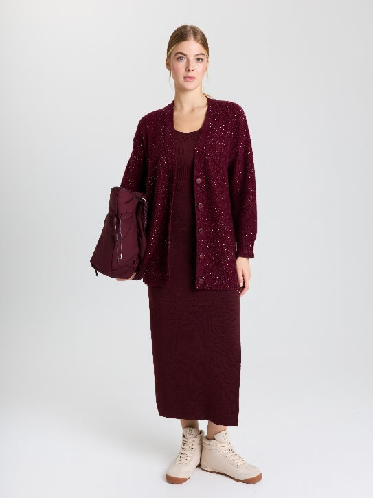 Насыщенный винно-бордовый оттенок, напоминающий цвет поспевшей вишни, оживляет любую зимнюю одежду. Эксперты советуют сочетать его с нейтральными кремовыми и серыми цветами, чтобы подчеркнуть глубину и насыщенность вишневой палитры. Для создания более смелых образов можно комбинировать его с горчичными или охристыми тонами, создавая ударный контраст. Темный оттенок красного — один из уверенных лидеров среди трендов сезона, позволяющий сделать женский гардероб гораздо выразительнее.