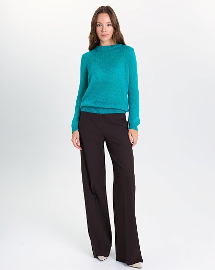 Эти брюки сочетают в себе элегантность и практичность. Модель свободного кроя пошили из эластичной саржи, что обеспечивает свободу движений и идеальную посадку. Брюки застегиваются на молнию и крючок.
