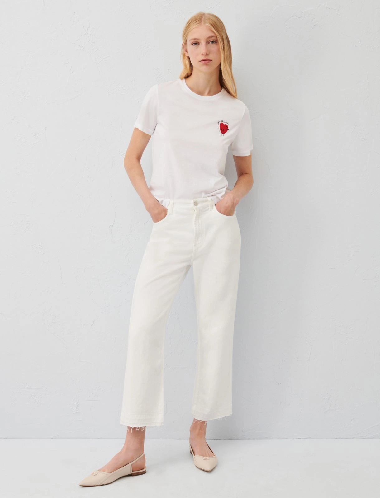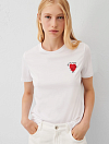 Базовая футболка из хлопкового джерси - обязательная вещь в гардеробе.  Модель классического прямого кроя  дополнена контрастными декоративными деталями.  Круглый вырез горловины, короткие рукава.