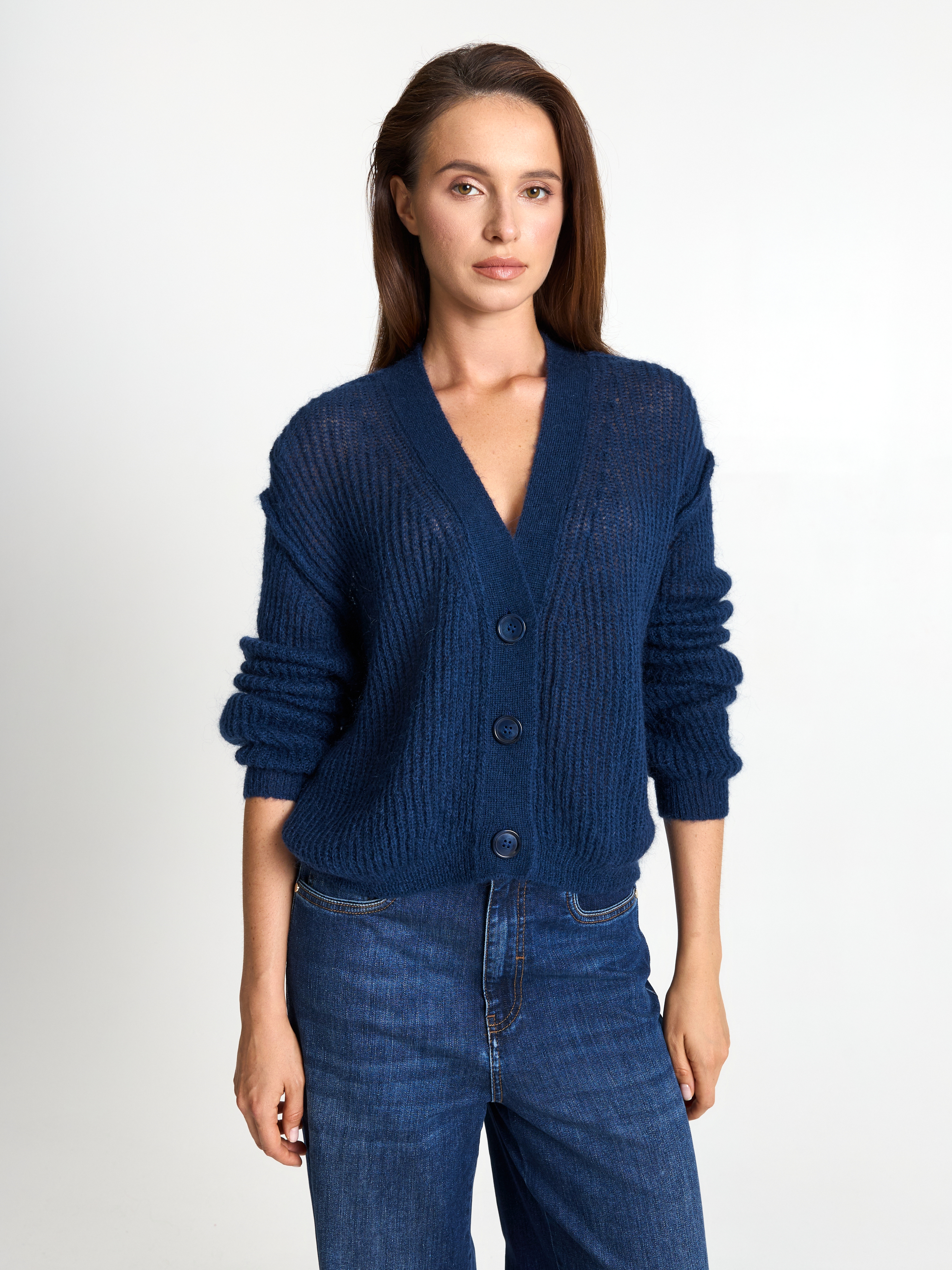Создайте стильные, многослойные образы на основе этого кардигана. Связали кардиган из пушистой мохеровой пряжи, которая делает его идеальным выбором в прохладные дни. Модель свободного силуэта представлена с V-образным вырезом и застегивается на пуговицы.