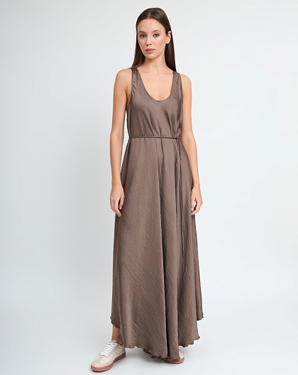 Ткани чередуются между струящимися и фактурными материалами, создавая непрерывный диалог между структурой и движением. Плотный хлопок сочетается с мытым льном, а атласная вискоза играет с крепом и изысканным трикотажем, создавая образ утонченного комфорта. Цветовая палитра отражает гармонию средиземноморской природы — от мягких белых до песочных и теплых коричневых оттенков через глубокий синий и оттенок зеленого мха.